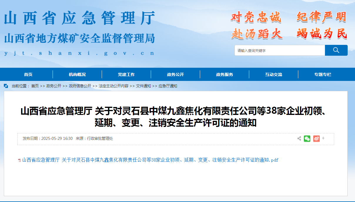 山西省應(yīng)急管理廳 關(guān)于對(duì)靈石縣中煤九鑫焦化有限責(zé)任公司等38家企業(yè)初領(lǐng)、延期、變更、注銷(xiāo)安全生產(chǎn)許可證的通知
